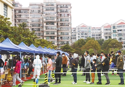 三月十九日,上海康城居民排队接受核酸采样。上海康城共有二百八十六个楼栋,约四万居民,是上海最大的居民小区。