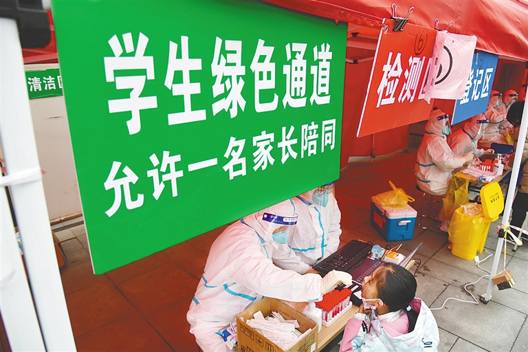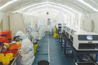 3月18日晚,医务人员在哈尔滨市移动实验室中工作。