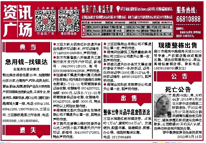 银达典当诚信经营23年,全国连锁分店25家,办理房产、汽车、名表、钻石、黄金、铂金、股票、数码产品及大宗房地产项目等典当贷款业务。正规专业、快速灵活、高额低息。海口公司:国贸玉沙路椰城大厦一层。电话:68541188、68541288、13307529219。三亚公司:三亚解放路第三市场旁,电话:88558868,13518885998。