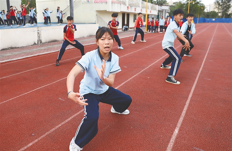 今年3月初,一场兼具趣味性与竞技性的全员运动会在琼中一小上演,由该校教师原创的黎舞韵律操揉合广播体操、黎歌、竹竿舞等多种元素,孩子们个个挥汗如雨却乐在其中。马步稳扎,气聚丹田,一招一式间化作呼呼拳风……随着琼中湾岭学校于2018年引入省武术协会的“相子道”武术运动项目,如今该校习武之风蔚然兴起。