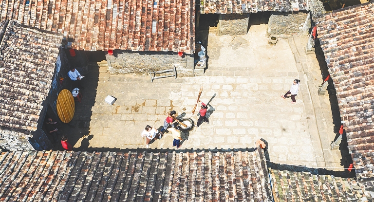 5分钟左右,王春香与合作的村民柯丽丹便大汗淋漓,换另外两人上场。此时,柯丽丹带头唱起了欢快的儋州调声《祝姑九点半》为大家鼓劲,四合院里吆喝声、调声此起彼伏……