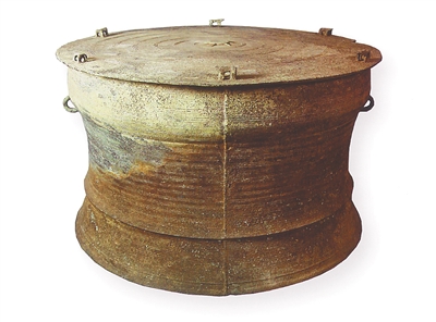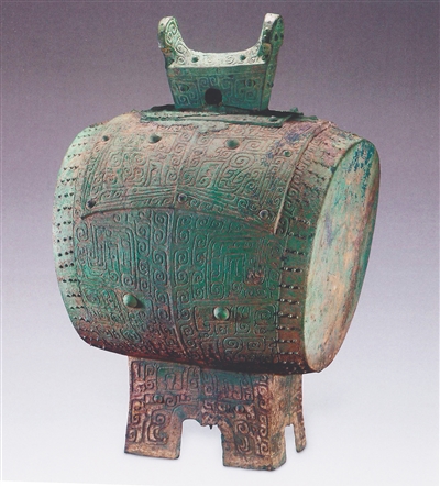 鼓是我国传统打击乐器,通常以鼓槌击之发声。在古代,鼓也是有名的军乐器,《左传·庄公十年》云:“夫战,勇气也。一鼓作气,再而衰,三而竭。”古人作战,击鼓进攻,鸣钲则止。从考古发现来看,先秦时期的钲自然是铜器,但与钲同时发现的铜鼓却较少,另有一些青铜鼓座被发现,所以文献中的战鼓应该大都由皮、木等易损坏的材质制成,未能保存至今。湖北崇阳出土的商代兽面纹铜鼓,仿鼓面横置的木质皮鼓形制,是极其罕见的铜质鼓之一。
