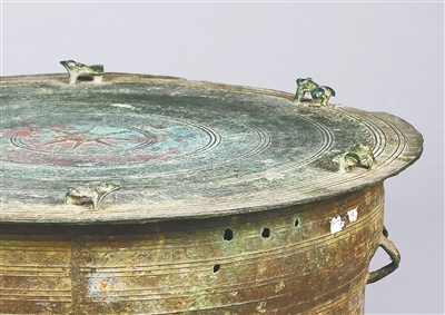 相较于石寨山型铜鼓,北流型铜鼓一般形体更为硕大。儋州市博物馆藏的这面四耳蛙纹北流型铜鼓,鼓面明显伸出鼓体外,腰、足间有一道道凸棱分界;鼓面中心有太阳纹,多重晕圈围绕,鼓面边缘一周有6只立蛙。