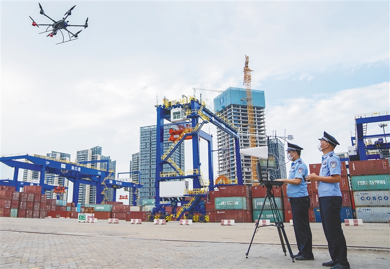 3月21日,在海口秀英港,海口出入境边防检查总站秀英边检站的工作人员利用无人机在巡查。