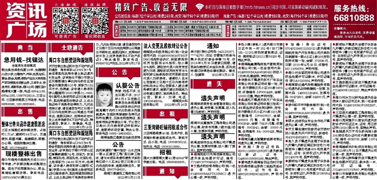 男婴,姓名不详,出生日期不详,2017年6月8日在昌江黎族自治县海尾镇昌化林场派出所往海尾镇方向约8米处的排水沟里被遗弃,发现时男婴被粉色带花点的布包裹住,无其他明显特征,现登报寻找该男婴生父母,于公告之日起60天内持有效证件前来认领,逾期将依法安置,特此公告。联系电话:0898-26633620。
