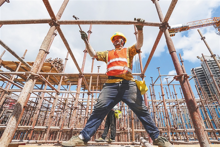 在海口江东新区建设工地,建筑工人加班加点,挥汗如雨,确保重要工程按质如期交付使用;