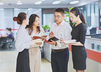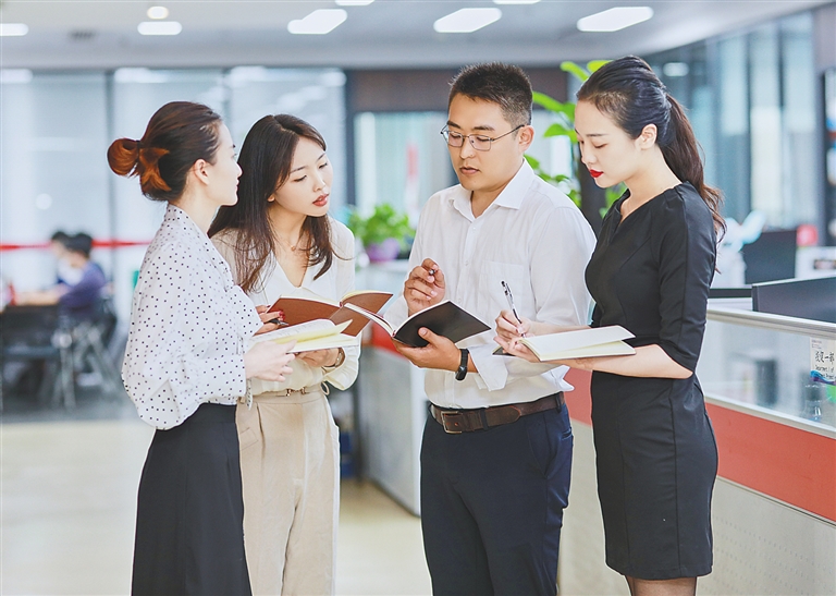 在洋浦经济开发区,企业联络员与企业管理者坐在一起,商量着解决企业在申领惠企资金中遇到的新情况;