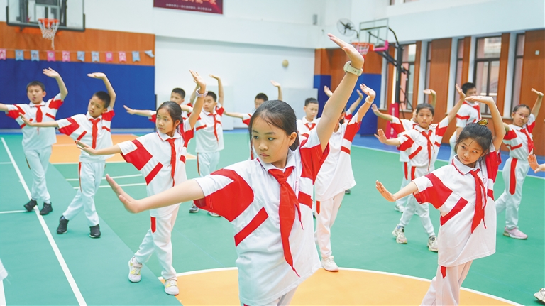 3月23日,在人大附中海口实验学校,四年级学生在进行第一套戏曲广播操运动。 本报记者 张茂 摄