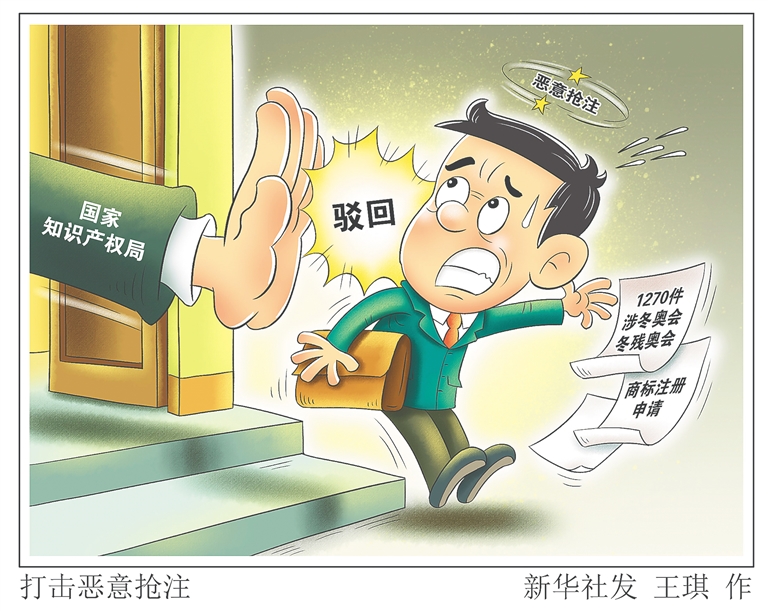 新华社北京3月23日电 (记者王琳琳)记者从国家知识产权局获悉,继2月14日国家知识产权局依法打击恶意抢注“冰墩墩”“谷爱凌”等商标的行为后,该局同时对恶意抢注北京2022冬奥会、冬残奥会吉祥物、口号、运动员姓名、场馆名称等商标注册申请予以坚决打击。