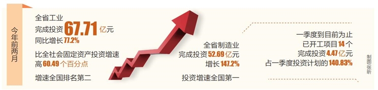 本报海口3月24日讯(记者邵长春 通讯员陈玉勇 吴兰枝)海南日报记者从省工业和信息化厅获悉,今年前两月全省工业完成投资67.71亿元,同比增长77.2%,比全社会固定资产投资增速高60.49个百分点,增速全国排名第二,实现“开门红、开门稳”。