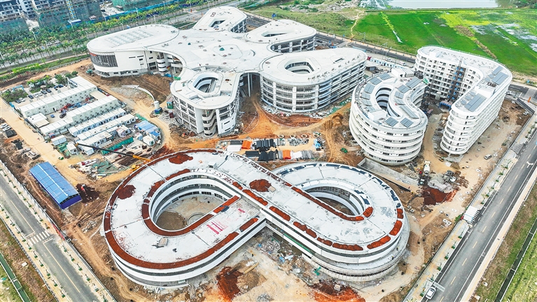 近日, 俯瞰位于海口江东大道的江东寰岛实验学校项目工地。目前,该项目已经全部封顶,正在进行精装修、园林市政等施工,计划今年9月正式投入使用。