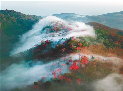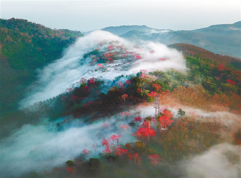 红硕的木棉花,率先跳入人们视野,欣欣然地带来一丝律动;风铃木如期盛放,以一抹明黄,点亮海南春天的色彩盘;道路两旁的火焰木,花开正“焰”,镶着金边的红花瓣开得昂首舒展,意气风发……