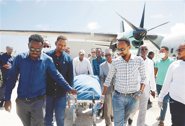 3月24日,在索马里摩加迪沙机场,人们运送贝莱德温爆炸袭击事件遇难者的遗体。