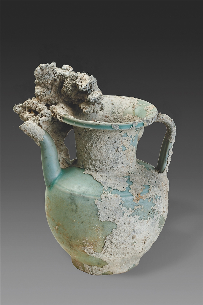 由于“华光礁I号”所处的位置为珊瑚礁盘,在船触礁沉没后,各种船货散落在海底,被海底海流、泥沙冲击掩埋,同时被海底生物附着。年深日久后,这件执壶口流之间,自然形成美丽的珊瑚胶结,器身也附着了厚厚的珊瑚和沉积物。