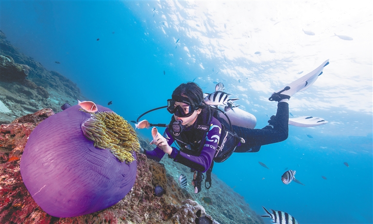 3月25日,当游客们来到三亚蜈支洲岛旅游区,换上潜水装备,暂别椰风海韵潜入蔚蓝海底,眼前展现一派生机勃勃的世界:红的、蓝的、黄的软体珊瑚正摇曳身姿,形态各异的鱼儿在自由自在游动……