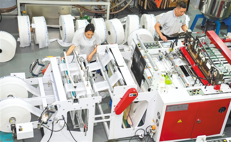 近日,在海口高新区金鹿工业园的中科信晖(海南)新材料科技有限公司吹膜生产线,一派忙碌景象。据了解,海口市“十四五”规划纲要明确,将海口国家高新区打造成全生物降解材料产业集聚区,成为重要的生物降解材料生产基地。截至目前,该园区已落地注册可降解材料生产企业20家,已有10家企业投产,4个项目在建,初具产业规模。本报记者 袁琛 实习生 张芷毓 图/文