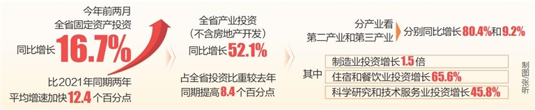 具体来看,产业投资高速增长,投资结构持续优化。1月至2月,全省固定资产投资同比增长16.7%,比2021年同期两年平均增速加快12.4个百分点。其中非房地产开发投资同比增长24.2%,占固定资产投资比重较去年同期提高3.8个百分点。全省产业投资(不含房地产开发)同比增长52.1%,占全省投资比重较去年同期提高8.4个百分点。分产业看,第二产业和第三产业分别同比增长80.4%和9.2%,其中制造业投资增长1.5倍,住宿和餐饮业投资增长65.6%,科学研究和技术服务业投资增长45.8%,卫生、社会保障和社会福利业投资增长56.1%。