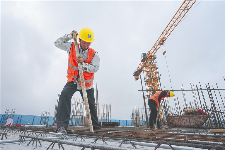 在主楼的内隔墙施工现场,工人们正将横截面布满“圆洞”的蒸压陶粒混凝土墙板拼接组装到一起。