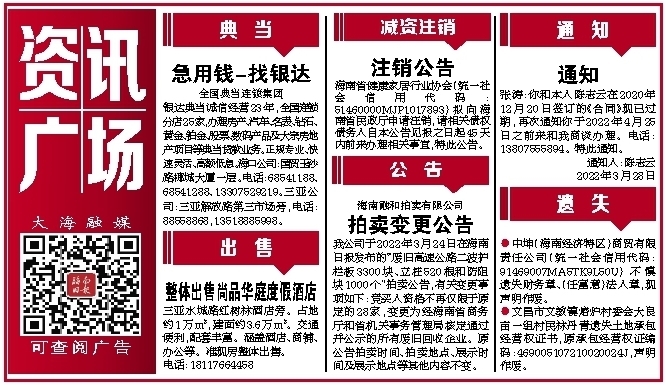我公司于2022年3月24日在海南日报发布的“废旧高速公路二波护栏板3300块、立柱520根和防阻块1000个”拍卖公告,有关变更事项如下:竞买人资格不再仅限于原定的28家,变更为经海南省商务厅和省机关事务管理局核定通过并公示的所有废旧回收企业。原公告拍卖时间、拍卖地点、展示时间及展示地点等其他内容不变。