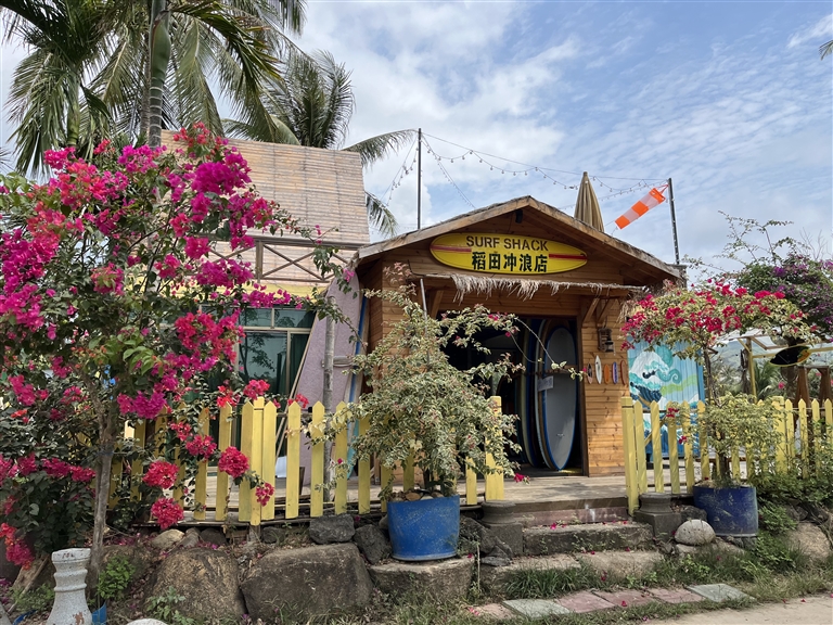 开车进入田新村,两车道的进村路两旁,大大小小的餐饮店不时映入眼帘,冲浪板状的彩旗迎风飘扬,一些冲浪板被放在路边晾晒。再往里走,可看到超市、摩托车修理店、五金店、冲浪俱乐部,以及一栋栋颇具风情的民宿建筑。