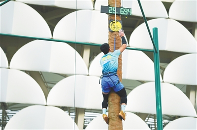 据了解,“攀椰竞速”之所以能成为竞技体育比赛项目,和它竞赛规则较为简单、趣味性强有关。按照现行竞赛规则,比赛用椰子树通常高10米到11米,有天然椰子树和人工制作的仿真椰子树两种。参赛选手自选攀爬姿势,爬到椰子树顶端并触碰铃铛,用时最短者获胜。