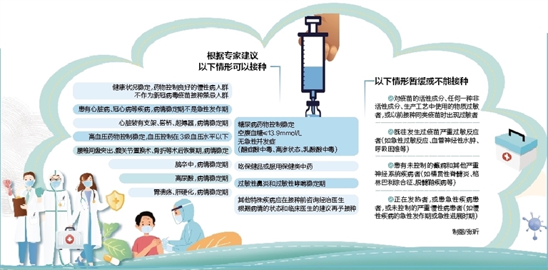 符振旺表示,国内外研究表明,只要健康状况稳定,药物控制良好的慢性疾病人群,以及未处在疾病急性发作期的人群,是可以接种新冠疫苗的。建议老年人及其家属切勿自行判断,可以到接种现场由专业医生为您判断是否适合接种,不要因为自己的判断错过接种疫苗对您的免疫保护机会。