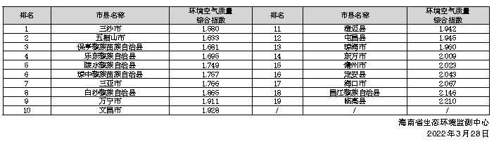 环境空气质量排名靠前的市县分别是三沙市、五指山市和保亭黎族苗族自治县,排名靠后的分别是临高县、昌江黎族自治县和海口市。2021年全省19个市县环境空气质量排名如右: