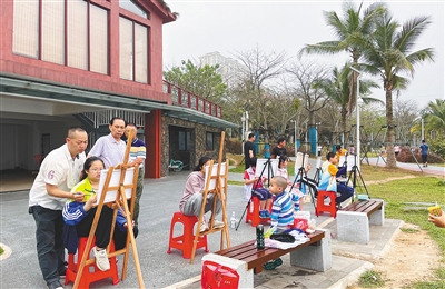 3月27日,在海口市红城湖公园,小学生们在老师的带领下通过户外写生,亲近大自然,感受大自然之美,度过快乐的周末。