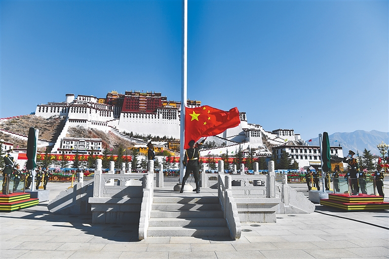 3月28日,西藏各族各界群众聚集在拉萨布达拉宫广场,升国旗、唱国歌,庆祝西藏百万农奴解放纪念日。