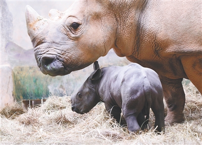 3月29日凌晨,广州长隆野生动物世界的白犀牛“维维”成功产下一头雄性幼崽,目前新生幼崽已顺利吃上母乳,健康状况良好。图为新生的白犀牛幼崽与母亲“维维”在一起。新华社发