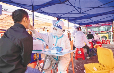 3月30日,在海口秀华路的一处核酸检测点,海口市第三人民医院的护士在为市民采样。
