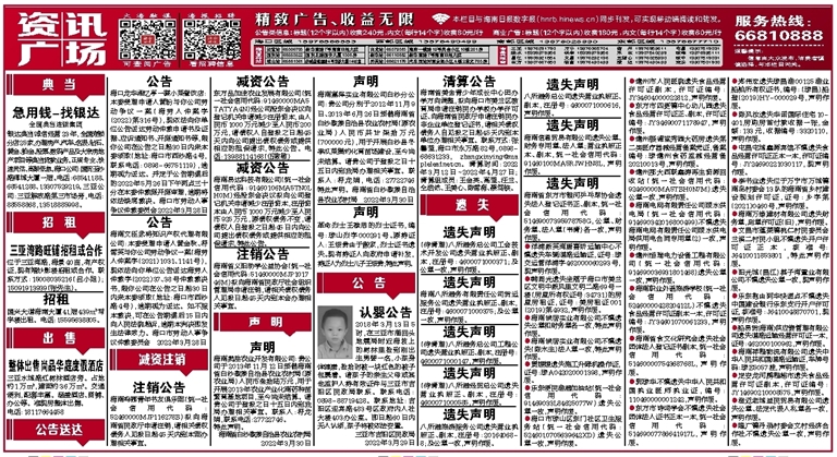 八所港旅游服务公司遗失营业执照正、副本,注册号:20164068-8;及公章一枚,声明作废。