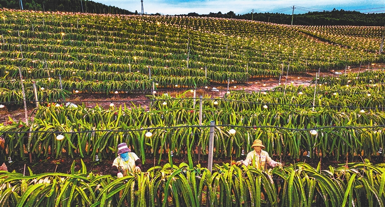 3月29日傍晚,东方市水果岛三家火龙果种植基地灯光璀璨,蔚为壮观。据介绍,这是该基地引入的灯光补给系统,运用现代化科技手段,对火龙果进行催花补光,让火龙果拥有良好的成长环境,从而提升火龙果产量和品质。 本报记者 陈元才 摄