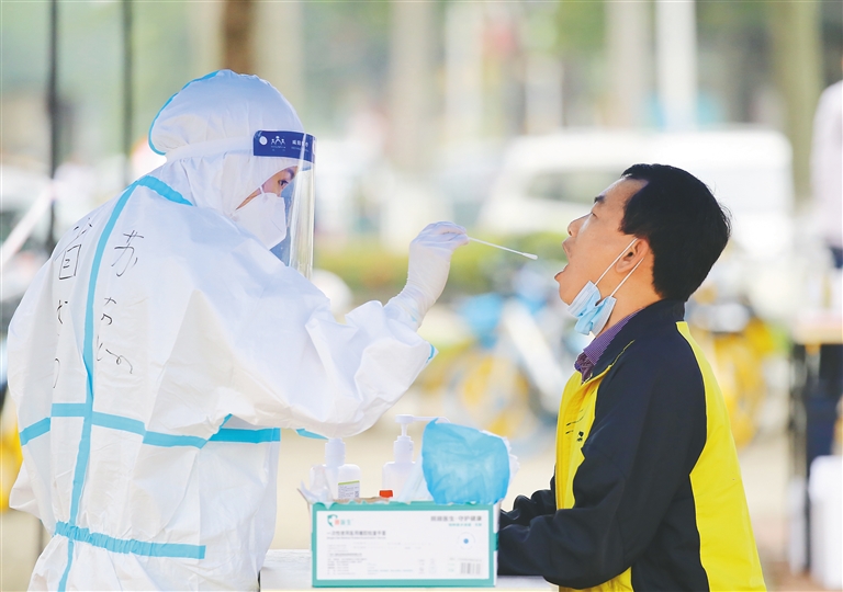 3月31日,在海口转码核酸采样便民服务点琼山区滨江公馆前空地,医护人员给市民进行核酸采样。本报记者 张茂 摄