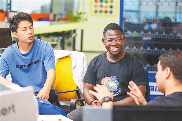 3月30日,海口复兴城互联网创新创业园,金斯福(中)和伙伴们在讨论工作方案。