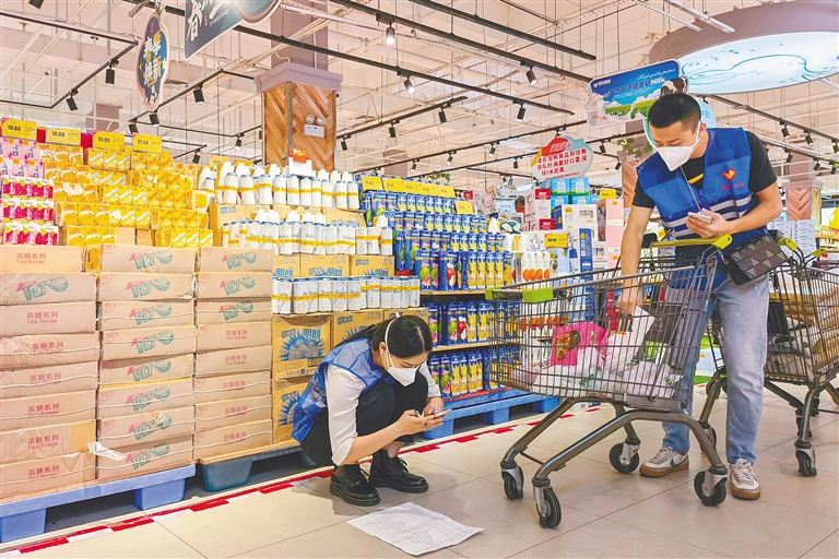 “于阿婆需要10斤面粉、2斤黄瓜、20个土豆”“除了蔬菜米面,杨先生还需要降压药”……4月5日13时许,在三亚市天涯区胜利购物广场旺豪超市内,两名身着蓝马甲的志愿者席地而坐,对照居民列出的物资清单仔细清点核对,一旁的两辆购物车被装得满满当当。