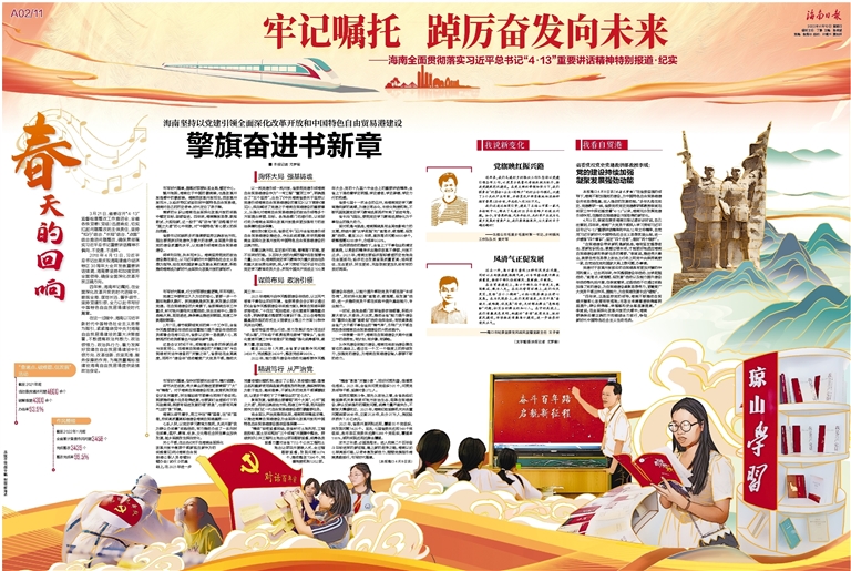 四年来,海南牢记嘱托,在全面深化改革开放的时代进程中,眼观全局、谋划长远、着手细节,坚持党建引领,全力以赴书写好中国特色自由贸易港建设时代篇章。
