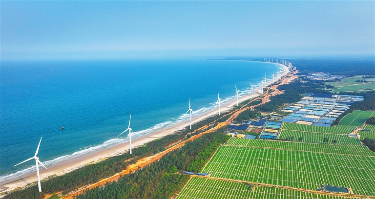 4月7日,在文昌市木兰湾沿海,风力发电机迎风转动。近年来,海南坚持绿色发展理念,探索发展风电产业,充分利用沿海优质风能资源,通过推进滨海风能绿色经济发展,努力实现“碳达峰、碳中和”目标任务。本报记者 张茂 摄