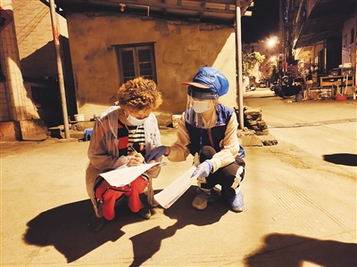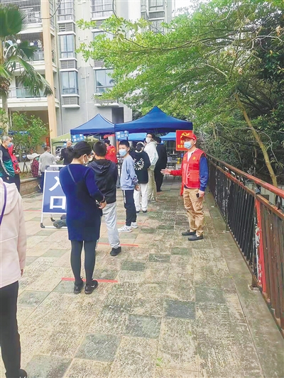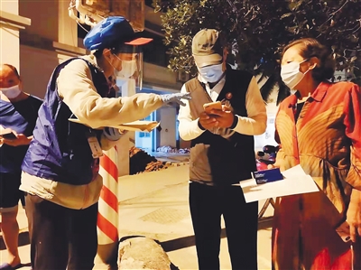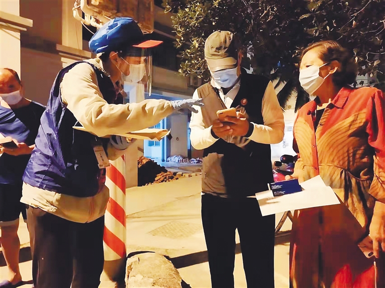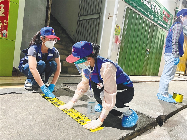 在群众到来以前,他们沿街布置一米隔离线、搬运防疫物资、搭建检测点;在群众到来时,他们一遍又一遍重复提示“请保持一米距离”“请出示健康码”“请戴好口罩”;在接到派发新型冠状病毒抗原检测试剂盒任务后,他们挨家挨户叩开民众的门,发放抗原试剂、指导民众试剂使用方法和检测结果发布方式并登记用户信息。此外,因电梯等密闭空间易产生交叉性感染,为避免志愿服务工作接触人群较多,几乎每一份抗原试剂的发放,他们都是爬楼梯完成的。