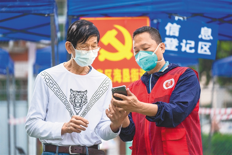 在核酸检测现场,也出现了海南农垦志愿者的身影。“小区里不少住户是老年人,不太懂使用健康码,得耐心讲解。”得知小区里要开展核酸检测工作,海南省农垦老干部服务中心活动指导科科长方思琼第一时间便穿上志愿服务的红马甲,来到现场与医护人员、社区工作者和物业工作人员并肩奋战在疫情防控一线。总是忙到深夜才回家,他却觉得再辛苦也值得,“我是一名党员,关键时刻一定得站出来。”
