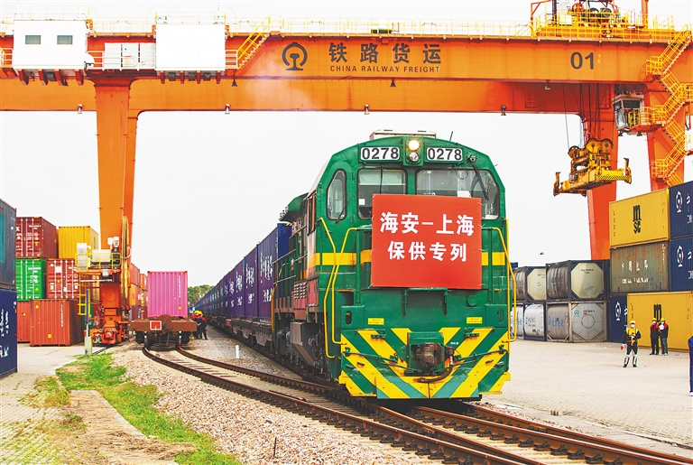4月9日,满载粮油等产品的“海安—上海保供专列”从江苏海安发往上海。 新华社发