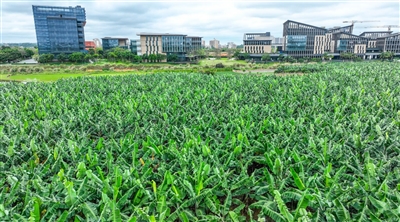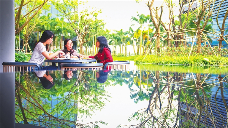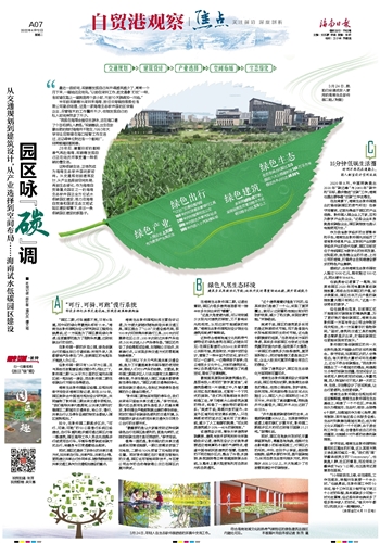 海南生态软件园景观设计师陈博杰说,园区在规划初期,就强调生态绿色的概念,包括公园绿地、防护绿地、农林用地、河流湖泊等生态空间占比超过2/3,园区八大公园面积达145万平方米,并采取了高绿量种植,特别是乔木比重很大,园区乔木占比达到了48.55%。