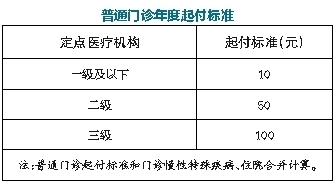 一级及以下定点医疗机构普通门诊报销年度起付标准为10元;二级定点医疗机构普通门诊报销年度起付标准为50元;三级定点医疗机构普通门诊报销年度起付标准为100元。