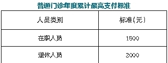 年度累计最高支付标准,简单来理解,是参保人按规定在一个自然年度内累计可以报销的最高费用。我省普通门诊年度累计最高支付标准分在职人员和退休人员两类,在职人员是1500元,退休人员是2000元。