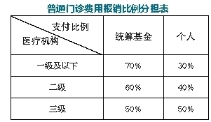起付标准以上、年度累计最高支付标准以下的普通门诊医疗费用,由统筹基金和参保人员按比例分担。定点医疗机构级别越高,个人支付的比例越高。也就是说在一级及以下定点医疗机构看普通门诊,个人支付比例较低;相反,在级别越高的医疗机构看普通门诊,个人支付比例较高。具体规定是在一级及以下定点医疗机构看病,从业人员医保普通门诊费用统筹基金支付70%,二级为60%,三级为50%。