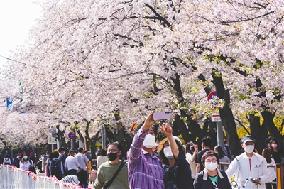 4月11日,佩戴口罩的人们在韩国首尔的一处公园赏花。