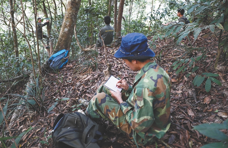 今年1月24日,天色未亮,海南长臂猿监测队员郑海强、倪德聪便同往常一样,从霸王岭镇区出发赶往山上的驻点,开启新一轮的海南长臂猿监测工作。“猿群醒得早,我们得比它们更早。”在陡峭山林间徒步攀爬1个小时后,两人顺利赶在猿群发出第一声啼叫前抵达海南长臂猿D群的监听点。