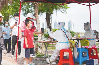 4月12日,在三亚市福海花园核酸采样点,志愿者给南海社区居民游客做信息采集。 本组图片均由本报记者 武威 摄