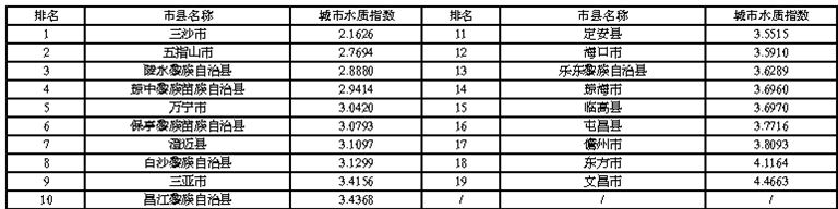 地表水环境质量排名靠前的市县分别是三沙市、五指山市、陵水黎族自治县,排名靠后的市县分别是文昌市、东方市、儋州市。2022年1—3月全省19个市县地表水环境质量排名如右: