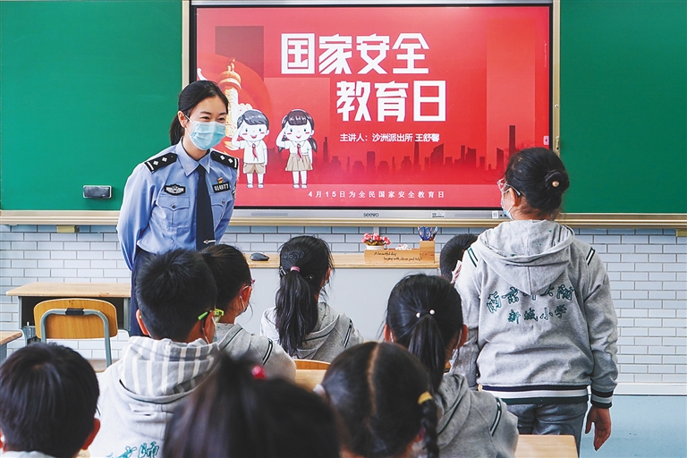 在第七个“全民国家安全教育日”即将来临之际,各地开展形式多样的主题宣传教育活动,提高人们的国家安全意识。图为4月14日,南京市公安局建邺分局民警在辖区内一所小学为同学们进行国家安全教育宣传活动。新华社发
